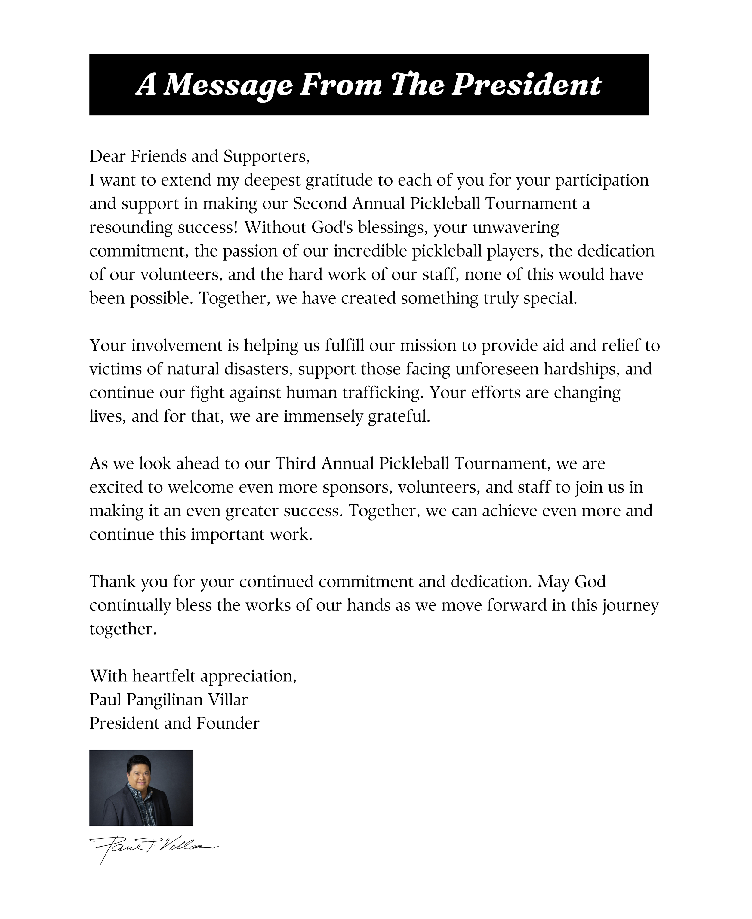 Taken place at Newport Coast Community Center, our second annual Pickleball Tournament was held to raise funds provide financial aid and support to disaster victims in the USA and the Philippines, offering helping hands to underprivileged individuals and families that are going through medical illness, bereavement, unemployment including children's education, shelter and food.